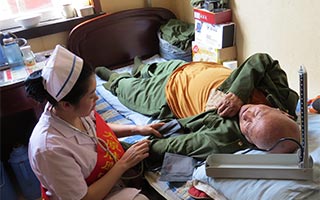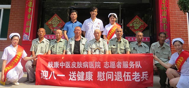 肤康中医皮肤病医院志愿者服务队是由医院医护人员自发组建的致的公益组织。本着“奉献、友爱、互助、进步”的志愿者精神,医护志愿者在为老兵们送上慰问品的同时为他们仔细进行健康检查和生活护理,用微笑和爱心让老兵们感受到浓浓的亲情和社会大家庭的温暖。